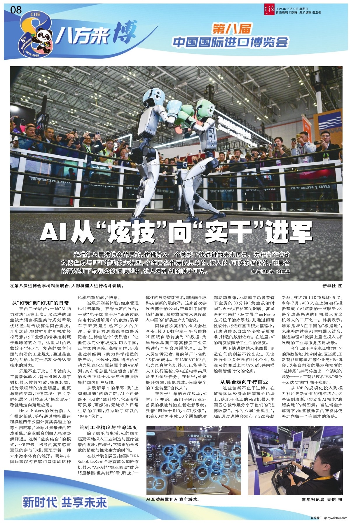 走进第八届进博会的展馆,仿佛踏入一个被按下快进键的未来图景。去年尚在谈论文案生成与PPT辅助的大模型,今年已化作无数具身的、嵌入的、可感的智能体,在展台的聚光灯下与观众的惊叹声中,让人看到AI的触手可及。青年报记者 刘晶晶