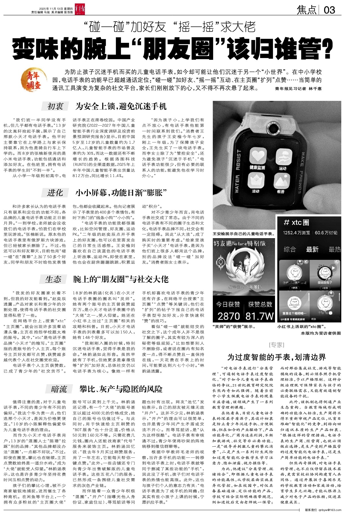而作为小天才电话手表用户,13岁的“混圈人士”陈珊“拉踩”别的品牌:“其他品牌都没办法‘混圈’,一点都不好玩。”不过,即使在圈里,攀比也在继续,主页点赞数始终是一道分水岭。“成为‘大佬’就能受人仰望。”林韵涵表示,这也是许多青少年坚持花费时间互相点赞的动力。