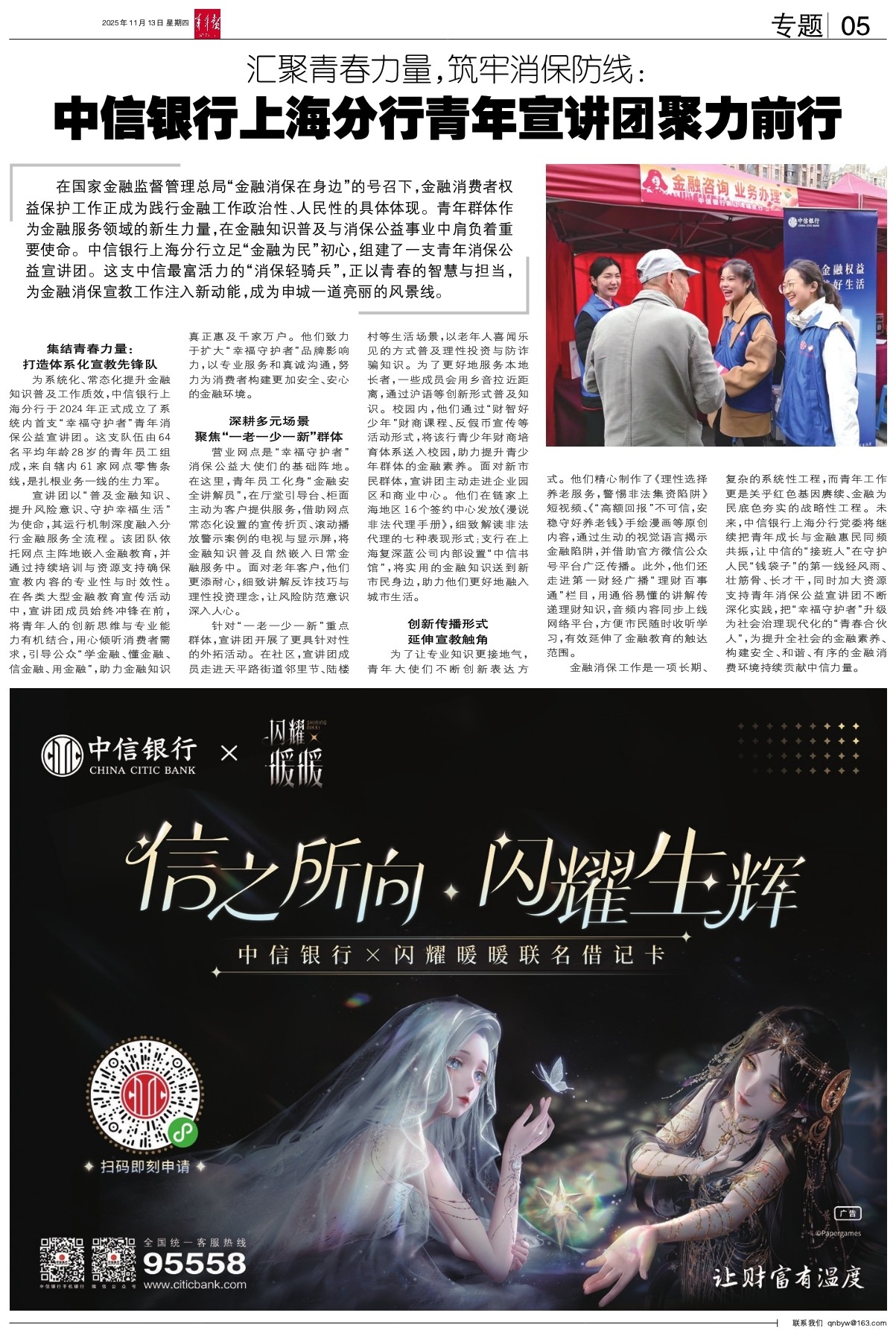 在国家金融监督管理总局“金融消保在身边”的号召下,金融消费者权益保护工作正成为践行金融工作政治性、人民性的具体体现。青年群体作为金融服务领域的新生力量,在金融知识普及与消保公益事业中肩负着重要使命。中信银行上海分行立足“金融为民”初心,组建了一支青年消保公益宣讲团。这支中信最富活力的“消保轻骑兵”,正以青春的智慧与担当,为金融消保宣教工作注入新动能,成为申城一道亮丽的风景线。