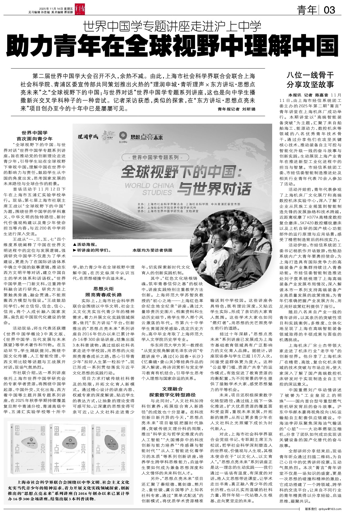 市社联介绍,这一系列讲座依托上海市世界中国学研究会的专家学者资源,将围绕中国学起源、中国外交、文化出海、西方看中国等主题开展专题系列讲座,在2025年秋季学期持续覆盖复旦附中青浦分校、青浦高级中学、五浦汇实验学校等十所中学,助力青少年在全球视野中理解中国,在历史纵深中认识当代,在思想碰撞中启迪未来。