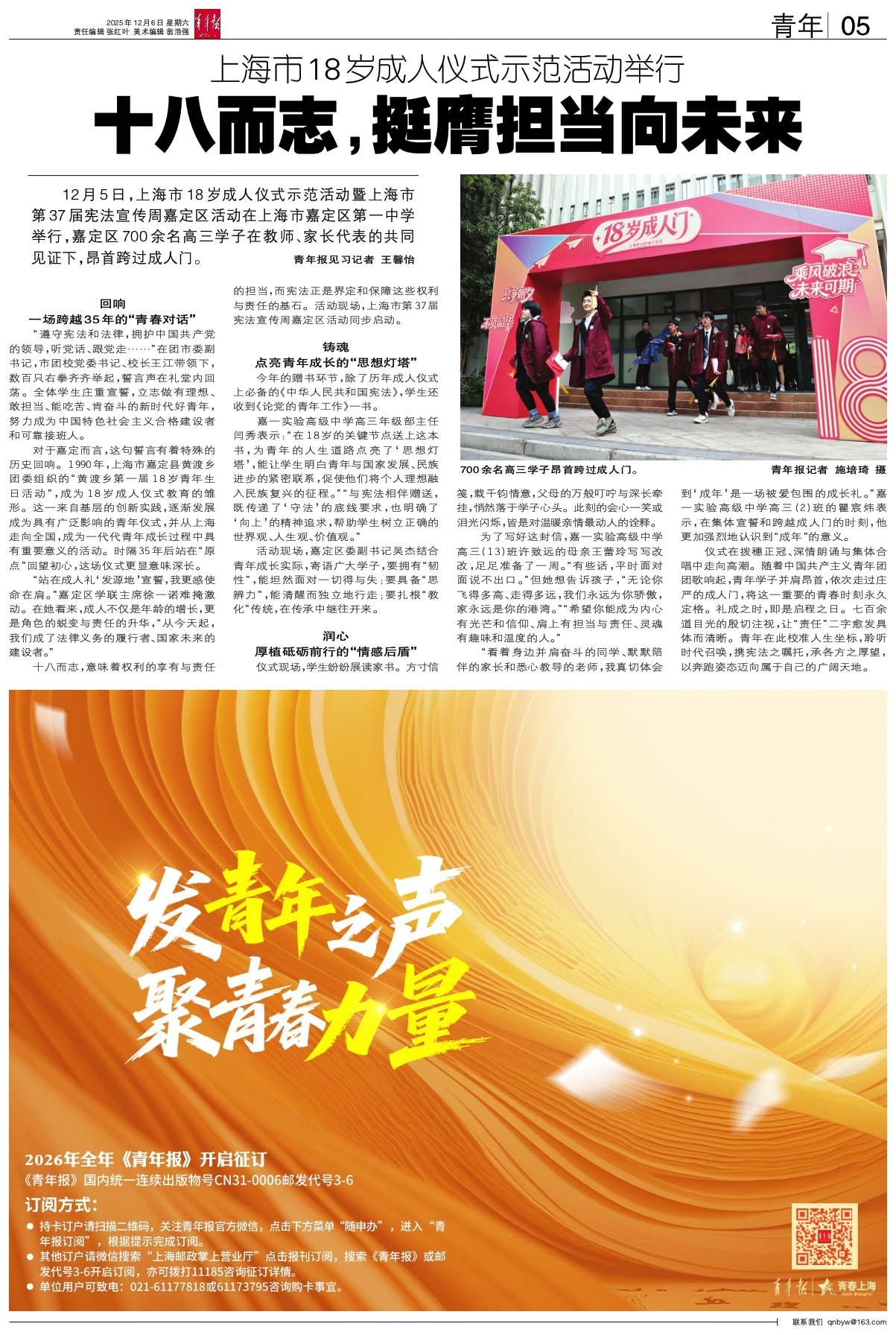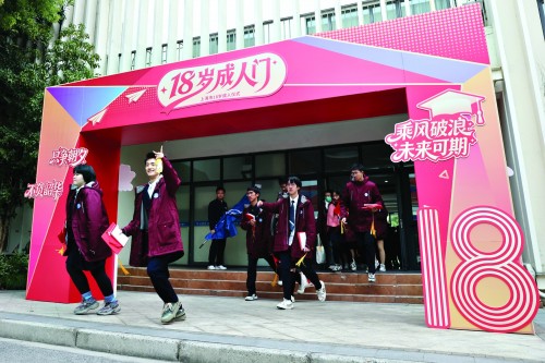 12月5日,上海市18岁成人仪式示范活动暨上海市第37届宪法宣传周嘉定区活动在上海市嘉定区第一中学举行,嘉定区700余名高三学子在教师、家长代表的共同见证下,昂首跨过成人门。