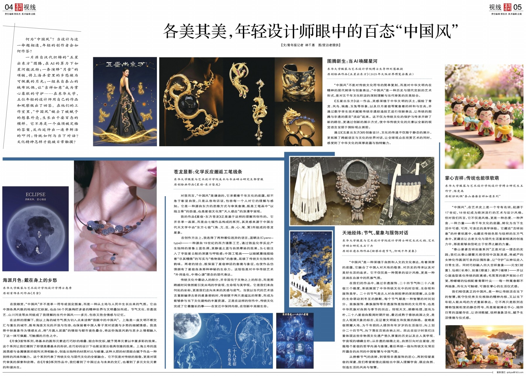 一片源自汉代织锦的“五星出东方”图腾,在AI的算力下如星河般流转;一条演绎“月食”的项链,将上海弄堂里的乡愁凝为可佩戴的月光;一组来自泰山的绒布玩偶,让“吉祥如意”成为掌心柔软的守护……在东华大学,五位年轻的设计师用自己的作品和观察做出了回答。在他们的工作室里,“中国风”褪去了被赋予的想象外壳,生长出千姿百态的模样。它不再是一个亟须被定格的答案,反而延伸出一连串鲜活的叩问:传统如何与当下对话?文化精神怎样才能被日常触摸?