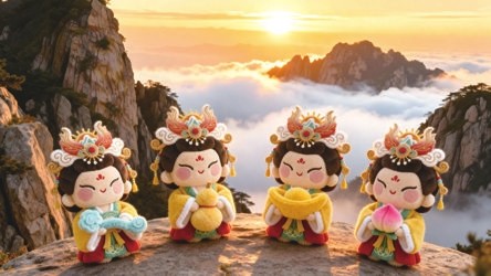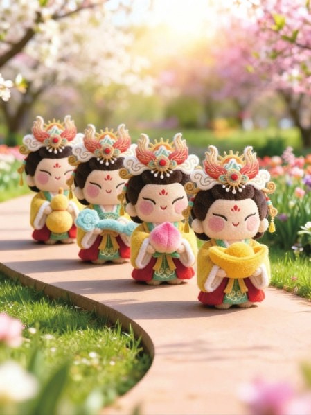 “泰山婆婆吉祥如意系列”正是对这一理念的实践:我们从泰山碧霞元君信仰中汲取灵感,将威严的女神化作圆润可亲的玩偶形象,让“守护”从神坛走入日常生活。同时巧妙融入四大吉祥意象——元宝(财富)、仙桃(长寿)、如意(顺遂)、葫芦(福禄)——并以Q版造型柔化传统的距离感:毛茸茸的葫芦宛如小灯笼,粉嘟嘟的仙桃配着青翠叶尖……每一种寓意都不再抽象,而化为可触碰、可握在掌心的生活仪式感。