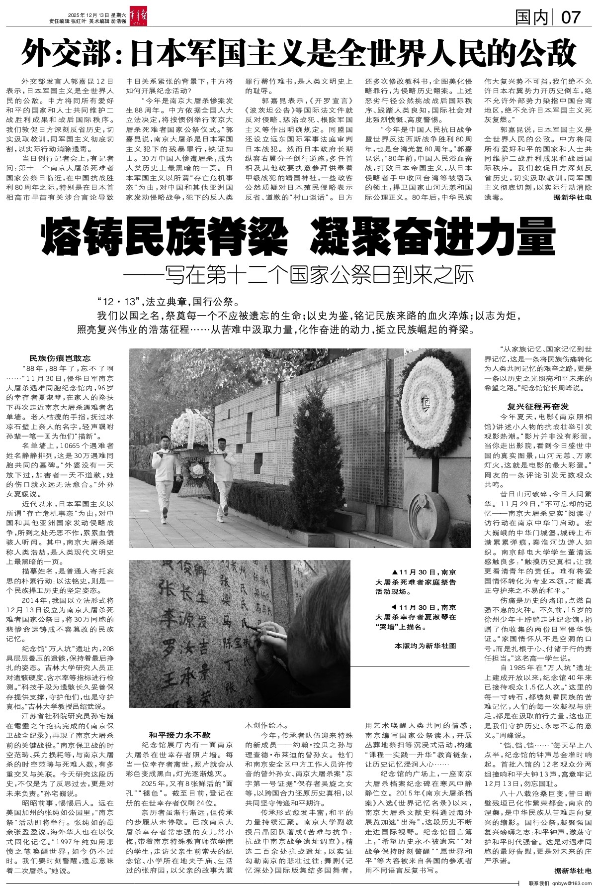 当日例行记者会上,有记者问:第十二个南京大屠杀死难者国家公祭日临近,在中国抗战胜利80周年之际,特别是在日本首相高市早苗有关涉台言论导致中日关系紧张的背景下,中方将如何开展纪念活动?