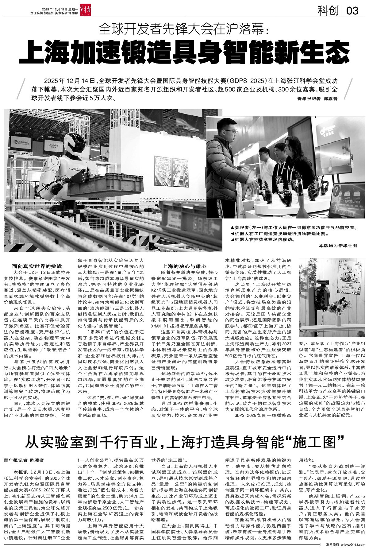 本报讯12月13日,在上海张江科学会堂举行的2025全球开发者先锋大会暨国际具身智能技能大赛(GDPS2025)开幕式上,浦东新区支持人工智能创新创业发展若干措施的发布,以精准的政策工具包,为全球先锋开发者与创新企业提供了扎根上海的第一重保障,展现了制度创新的“上海速度”。其中明确提出,全面启动张江人工智能创新小镇建设。针对新注册OPC企业(一人创业公司),提供最高30万元的免费算力。政策还配套推出“十个一”创梦政策包,包括免费工位、人才公寓、创业资金、算力券、场景对接等全方位支持,通过打造“低创新成本、高智力密度”的创业土壤,助力浦东三年内新增千家企业、人工智能产业规模突破2500亿元,进一步夯实上海在全球AI赛道上的竞争力与吸引力。