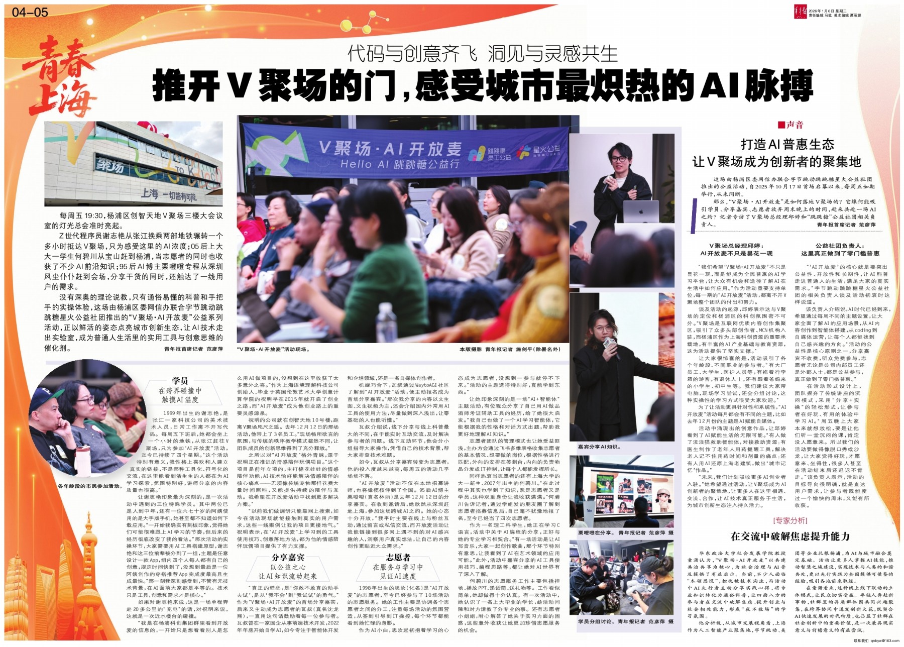 谈及活动的起源,邱婷表示这与V聚场的定位和杨浦区的科创氛围密不可分。“V聚场是互联网优质内容创作集聚区,吸引了众多头部创作者、MCN机构入驻,而杨浦区作为上海科创资源的重要承载地,有丰富的AI产业基础与教育资源,这为活动提供了坚实支撑。”