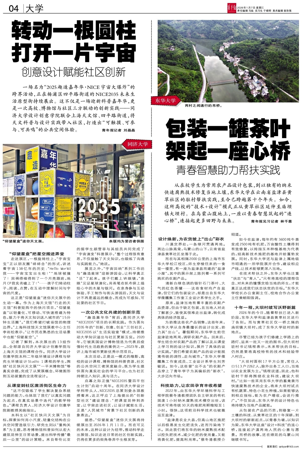 从包装农产品的巧思,到修复一片土壤的科技;从黄草社区的十年深耕,到大坝村的崭新起点,以青春为墩,以知识为梁,东华大学这座“设计+科技”的连心桥,连接起沪滇两地人民的心意与愿景。而桥的故事,还在绵延的乌蒙山间继续书写。