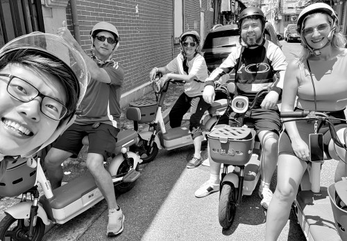 2025年8月底,导游带领外国游客在上海的弄堂里骑行电动车。新华社 图