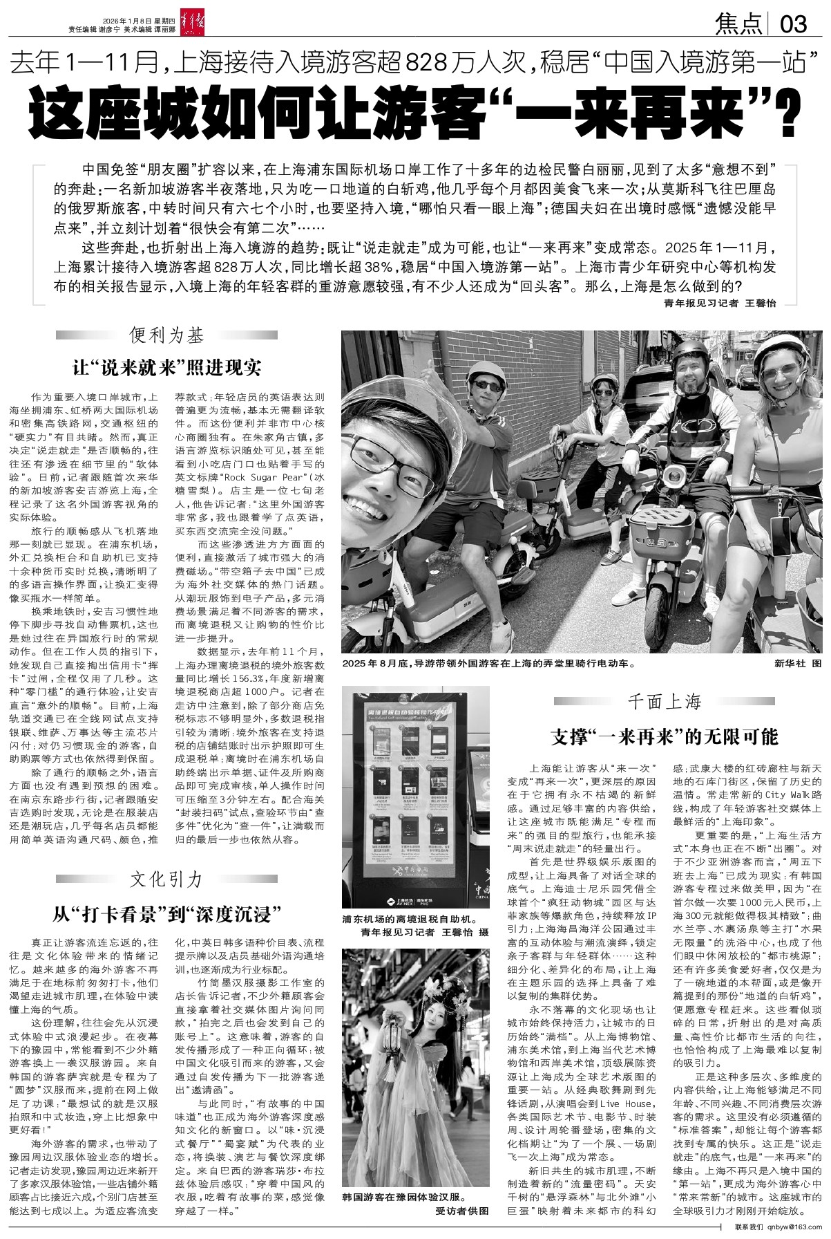这些奔赴,也折射出上海入境游的趋势:既让“说走就走”成为可能,也让“一来再来”变成常态。2025年1—11月,上海累计接待入境游客超828万人次,同比增长超38%,稳居“中国入境游第一站”。上海市青少年研究中心等机构发布的相关报告显示,入境上海的年轻客群的重游意愿较强,有不少人还成为“回头客”。那么,上海是怎么做到的?