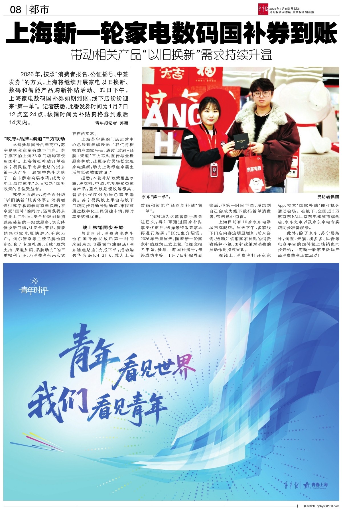 此番参与国补的电商中,苏宁易购和京东有线下门店。苏宁旗下的上海33家门店均可使用国补。上海首张补贴订单在苏宁易购位于南泉北路的浦东第一店产生。顾客林先生选购了一台卡萨帝高端冰箱,成为今年上海市家电“以旧换新”国补政策的首位受益者。