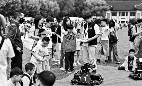 校友返校日当天举办的“校庆科创集市”,则是规模更大的展示与交流平台。活动共设置53个展位,分为AI及科技主赛道、学生社团创新实践区、院系科研成果展区三大板块展示项目。此外,科研活动还打破专业、年级限制,欢迎零基础同学参与。例如“复旦大学机甲大师工程师计划”通过培训让感兴趣的同学从零学习机甲制造。
