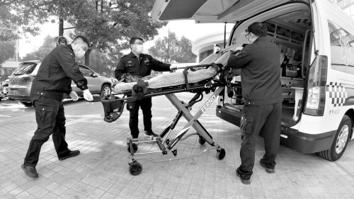 急救人员准备用担架床转运患者。青年报记者 常鑫 摄
