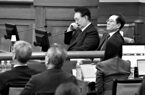 这是2025年2月20日尹锡悦(中)在韩国首尔宪法法院出席总统弹劾案庭审的资料照片。 新华社 图