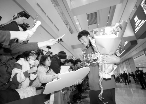 1月26日,中国队球员李昊(右)在机场和球迷互动。新华社 图