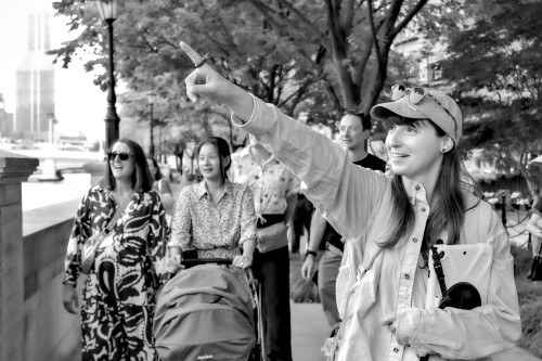 法国姑娘乐盖曦带领外国游客在上海City Walk。 新华社 图