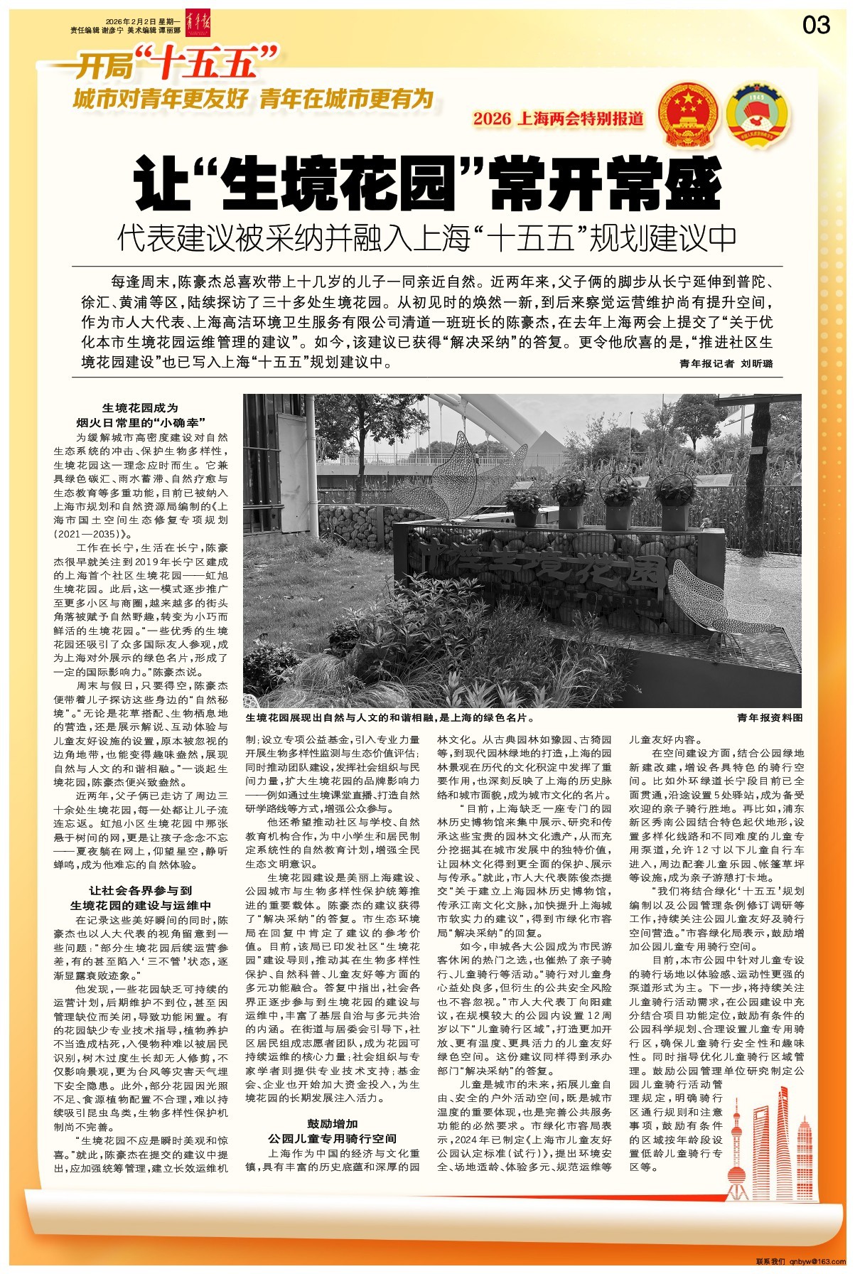 每逢周末,陈豪杰总喜欢带上十几岁的儿子一同亲近自然。近两年来,父子俩的脚步从长宁延伸到普陀、徐汇、黄浦等区,陆续探访了三十多处生境花园。从初见时的焕然一新,到后来察觉运营维护尚有提升空间,作为市人大代表、上海高洁环境卫生服务有限公司清道一班班长的陈豪杰,在去年上海两会上提交了“关于优化本市生境花园运维管理的建议”。如今,该建议已获得“解决采纳”的答复。更令他欣喜的是,“推进社区生境花园建设”也已写入上海“十五五”规划建议中。