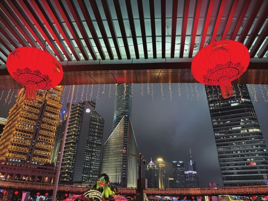 满天星灯珠与喜庆的红灯笼为陆家嘴换上浓郁的新年装扮。