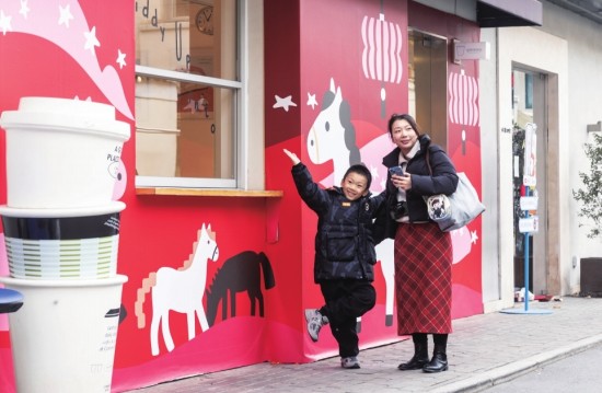 市民在马元素店铺装饰前打卡。