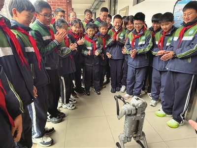 上海师范大学附属宝山经纬实验小学学生与智能机器狗趣味互动。受访者供图