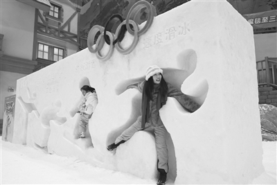 游客在耀雪冰雪世界体验冬奥雪雕打卡墙。新华社 图