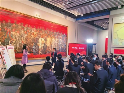 “这节课和以往的不太一样,老师让我们以小组为单位,在场馆里搜集史料拍照、记录,然后上台跟同学们分享,我觉得很有意思。”七年级学生陈宥礼说。