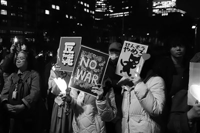 抗议者手举写有“不要战争”“反对修宪”等标语的牌子,呼吁维护和平宪法,守护和平。