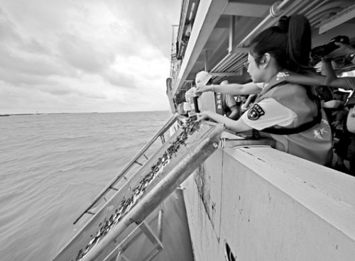 放流现场,青年志愿者们登上海洋渔业综合科考船“蓝海201”轮,前往放流水域。