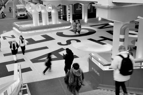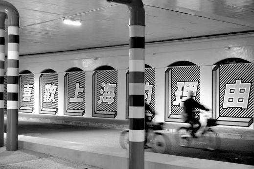 醒目的黄色,令人兴奋的红色,突兀的绿色,乃至于紫色、粉色、黑白色都在这个桥下空间有了自己的位置。还不仅仅是颜色,还有更多的由各种颜色交织而成的图案。潘山说,在这些图案中,他们还设计了很多“伪立体”图案,比如沿墙一排醒目的大字:“喜欢上海的理由”就浮在一个个立体图案之上,为了增强趣味性,有些立体图案下还放置了一把扶梯,让人有去爬一爬的冲动。