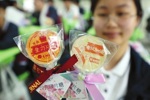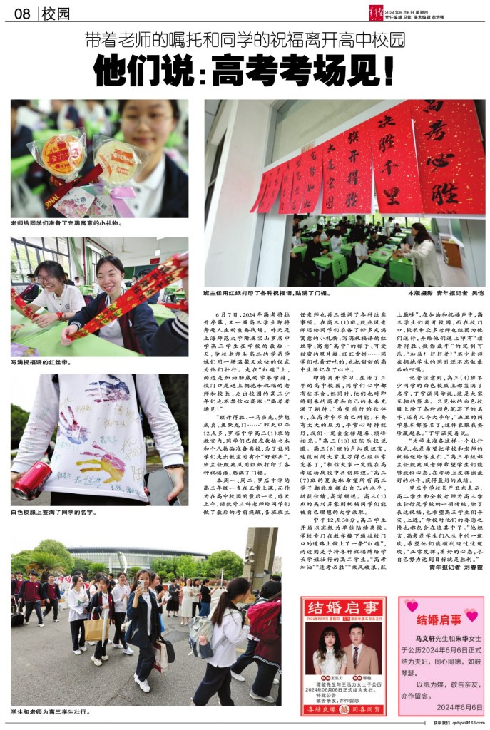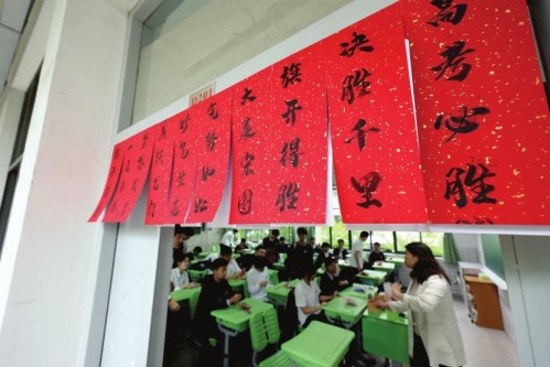 “旗开得胜、一马当先、梦想成真、鱼跃龙门……”昨天中午12点多,罗店中学高三(1)班的教室内,同学们已经在收拾书本和个人物品准备离校,为了让同学们走出教室时有个“好彩头”,班主任殷兆凤用红纸打印了各种祝福语,贴满了门楣。
