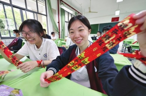 即将离开学习、生活了三年的高中校园,同学们心中都有些不舍,但同时,他们也对即将到来的高考和自己的未来充满了期待。“希望前行的伙伴们,在高考中尽自己所能,不要有太大的压力,平常心对待就好,我们一定会金榜题名、顶峰相见。”高三(10)班陈乐仪说道。高三(8)班的卢沁岚坦言,这段时间大家复习得已经非常完善了,“相信大家一定能在高考这场战役中共创辉煌。”高三(7)班的夏美琳希望所有高三学子都能发挥出自己的水平,斩获佳绩,高考顺遂。高三(1)班的吴刘苏蒙则祝福同学们能被自己理想的大学录取。