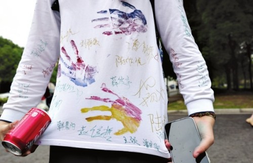 记者注意到,高三(4)班不少同学的白色校服上都签满了名字,丁宇涵同学说,这是大家互相的签名。只见她的白色校服上除了各种颜色笔写下的名字,还有几个大手印,“班里的同学基本都签名了,这件衣服我要珍藏起来。”丁宇涵笑着说。