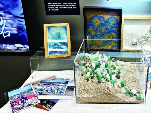 “我们还用青浜海岛环保公益发展中心收集的海玻璃,制作了装置作品《沙滩上的眼泪》,还原青浜岛海滩的景象——在沙粒和贝壳中,点缀着看似美好,实则是垃圾的海玻璃,它们犹如大海在沙滩上流下的眼泪,无声地诉说着海漂垃圾的荒诞旅程。”吴双补充道。