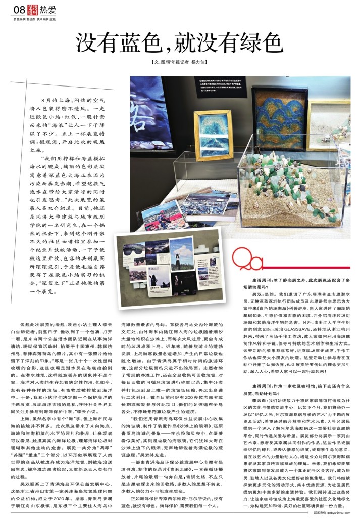 “我们用柠檬和海盐模拟海水的酸咸,绚丽的色彩层次寓意着深蓝色大海正在因为污染而暴发赤潮,希望这款气泡水在带给大家清凉的同时也引发思考。”此次展览的策展人吴双介绍道。目前,她还是同济大学建筑与城市规划学院的一名研究生,在一个偶然的机会下,来到这个刚开张不久的社区咖啡馆里参加一个纪录片放映活动,一下子便被这里开放、包容的共创氛围所深深吸引,于是便毛遂自荐获得了在欧邑小站实习的机会,“深蓝之下”正是她做的第一个展览。