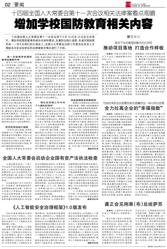 - 增加学校国防教育相关内容 十四届全国人大常委会第十一次会议将于9月10日至13日在北京举行。增加学校国防教育的相关内容和要求,完善防治统计造假、弄虚作假制度约束……在9日举行的记者会上,全国人大常委会法制工作委员会发
