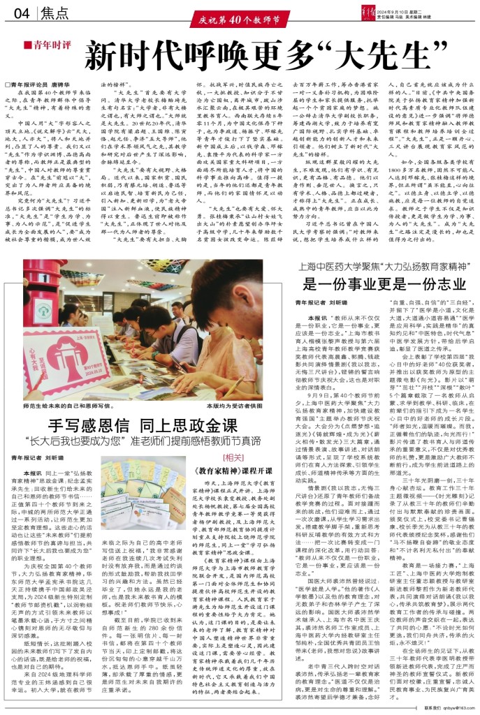 - 手写感恩信 同上思政金课 青年报记者 刘昕璐 本报讯 同上一堂“弘扬教育家精神”思政金课;纪念孟宪承先生;回收新生们给未来的自己和恩师的教师节书信……正值第四十个教师节到来之际,申城的两所师范大学正通过一