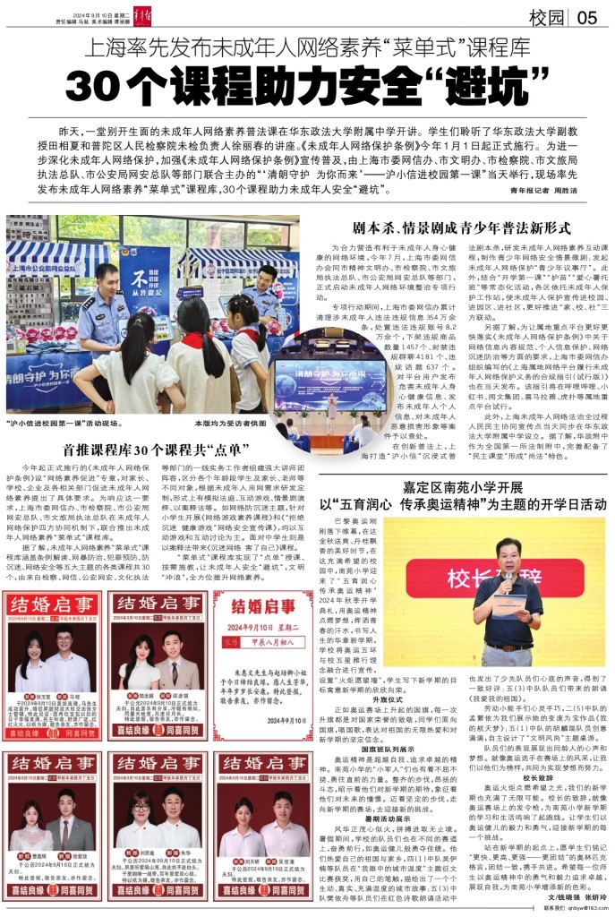 - 30个课程助力安全“避坑” 昨天,一堂别开生面的未成年人网络素养普法课在华东政法大学附属中学开讲。学生们聆听了华东政法大学副教授田相夏和普陀区人民检察院未检负责人徐丽春的讲座。《未成年人网络保护条例》今年1月1日起正式