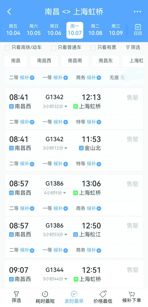 这两天,不少没买到火车票的旅客都在“蹲守”机票降价。记者在一些购票平台查询发现,国庆长假后期,不少航线的票价就开始“跳水”。以上海出发为例,10月6-7日飞往长沙、贵阳、青岛等地的机票最低1折起,含税票价比高铁票还便宜,如果错峰出行,将能享受高性价比。