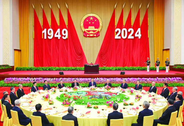 在欢快的乐曲声中,中外宾朋举杯共贺中华人民共和国成立75周年,祝福中国繁荣昌盛、人民幸福安康,中国人民和世界各国人民友谊长存。