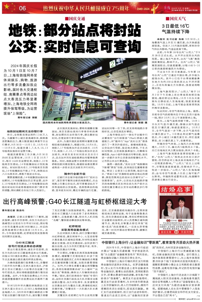 - 地铁:部分站点将封站 公交:实时信息可查询 2024年国庆长假为10月1日至10月7日,上海地铁线网将受休闲娱乐、购物、旅游出行等多流叠加效应影响,届时各大交通枢纽、商圈景点等周边站点大客流压力将显著增加,上海地铁全网将提升保驾等级,