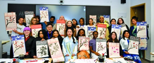穿上汉服,握着毛笔,调配墨汁,在传统书画中体验象形文字的魅力,感受中国水墨画蕴藏的中式审美。一笔一画,一撇一捺,“福”“禄”“寿”“财”“梅兰竹菊”……中外学生一边体验书画,一边感受文化交流与碰撞。