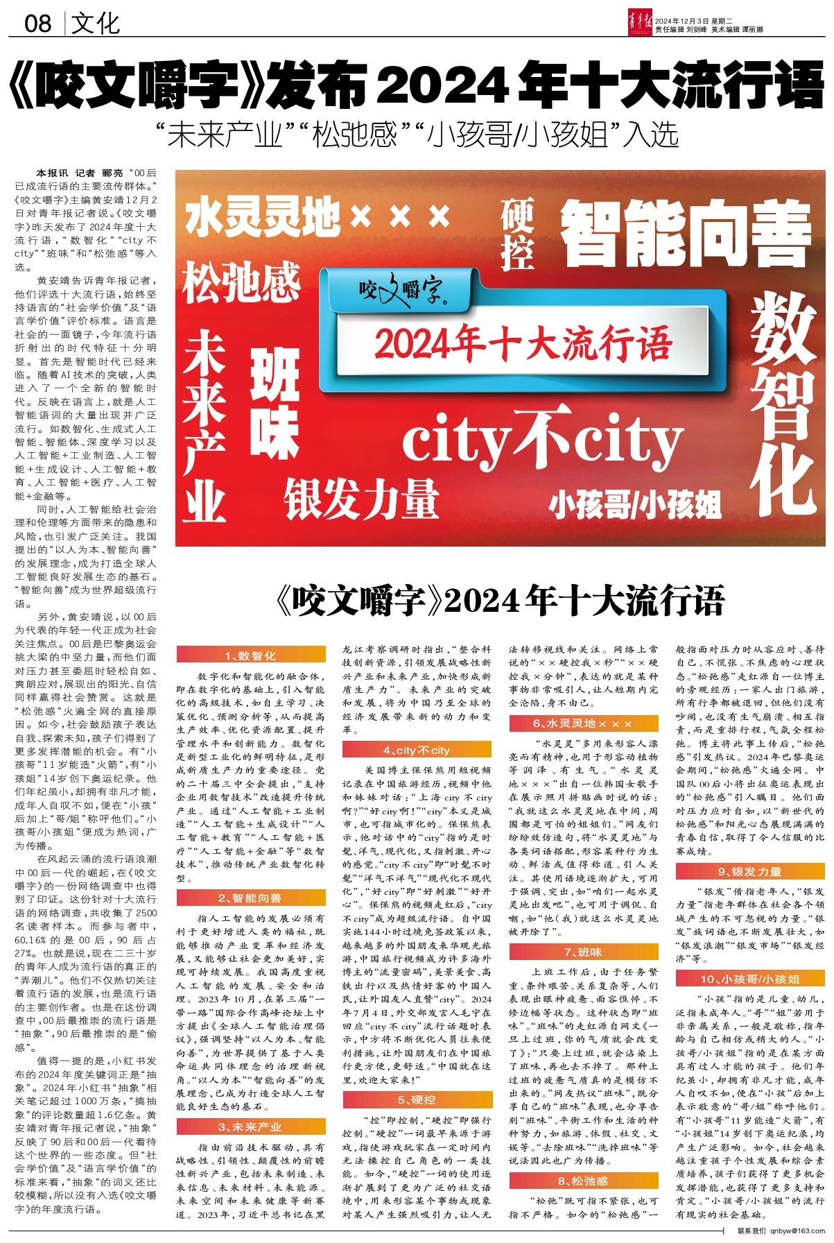 本报讯 记者 郦亮 “00后已成流行语的主要流传群体。”《咬文嚼字》主编黄安靖12月2日对青年报记者说。《咬文嚼字》昨天发布了2024年度十大流行语,“数智化”“city不city”“班味”