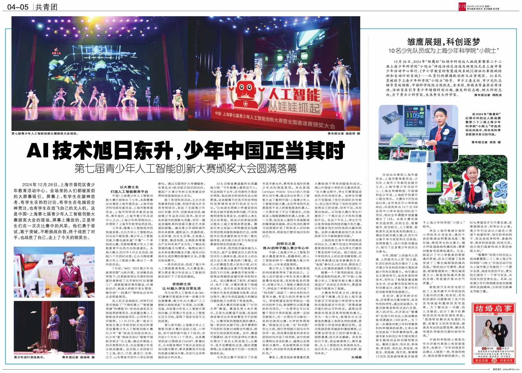 - AI技术旭日东升,少年中国正当其时 2024年12月28日,上海市普陀区青少年教育活动中心。会场里的人们都被面前的大屏幕吸引。屏幕上,有学生在凝神思考,有学生在热烈讨论,有学生在电脑前全神贯注,也有学生在放飞自己的无人机。这是