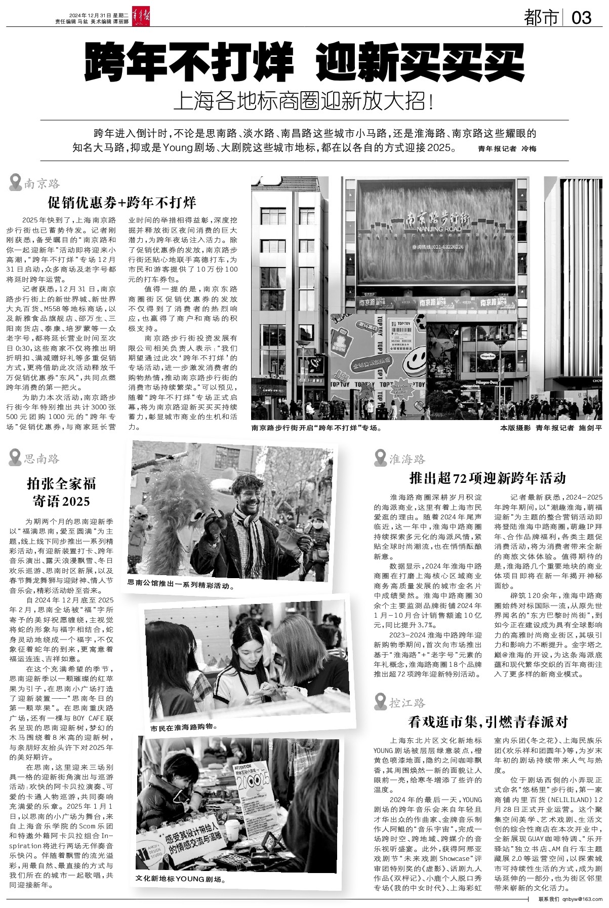 跨年进入倒计时,不论是思南路、淡水路、南昌路这些城市小马路,还是淮海路、南京路这些耀眼的知名大马路,抑或是Young剧场、大剧院这些城市地标,都在以各自的方式迎接2025。
