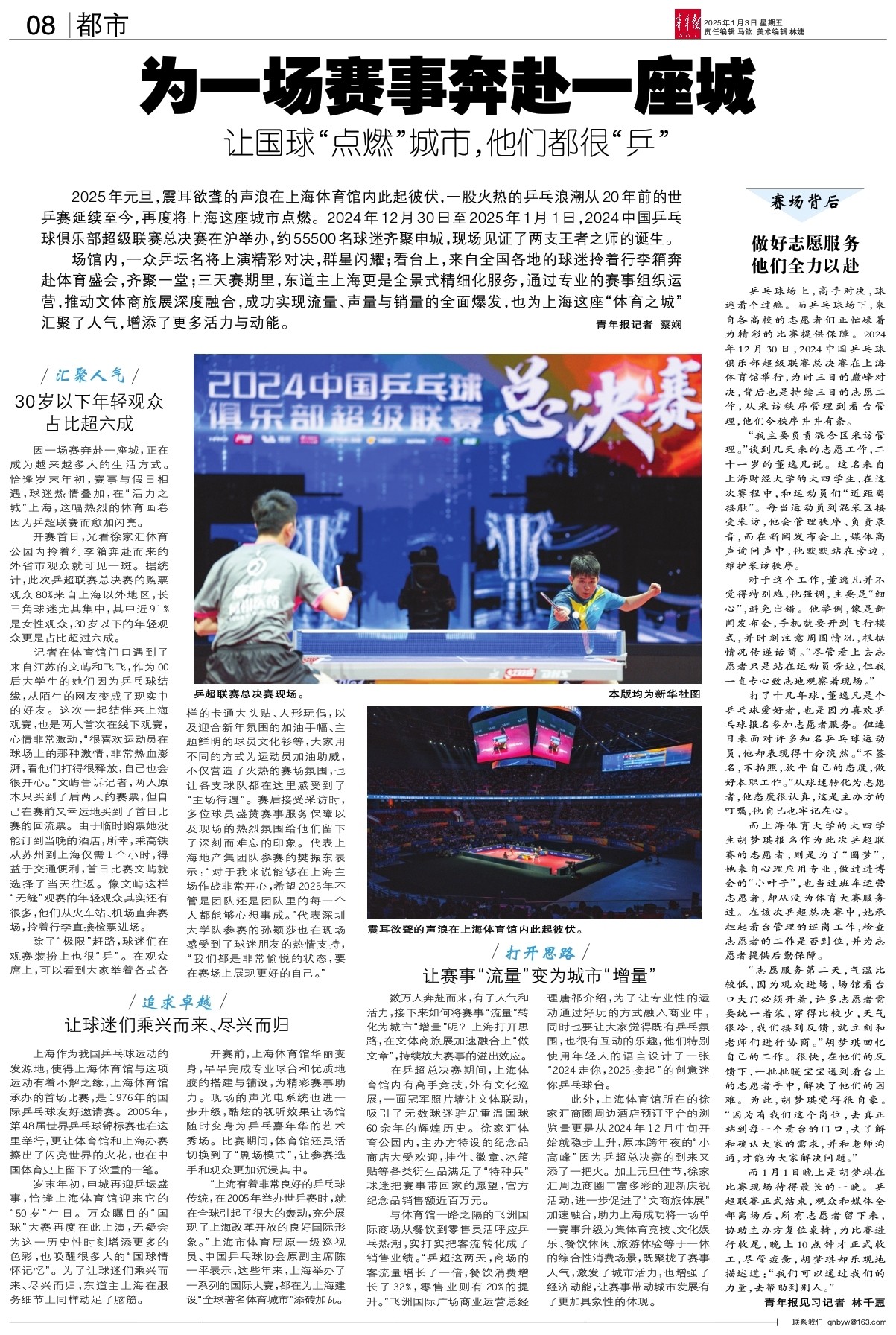 - 做好志愿服务 他们全力以赴 乒乓球场上,高手对决,球迷看个过瘾。而乒乓球场下,来自各高校的志愿者们正忙碌着为精彩的比赛提供保障。2024年12月30日,2024中国乒乓球俱乐部超级联赛总决赛在上海体育馆举行,为时三日的