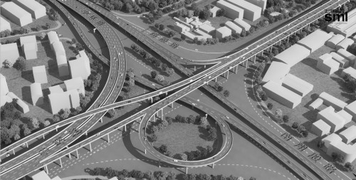 其中主线高架为城市快速路,设计车速80公里/小时,采用双向4-6车道通行规模;匝道设计速度40公里/小时,采用2车道通行规模;地面辅路为城市主干路,设计速度50公里/小时,采用双向6车道通行规模。