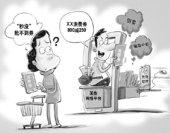 “XX消费券800减250,感兴趣的私”“代抢X月X日消费券”……网络平台上,代抢和售卖消费券却成了“黄牛”的生意经。