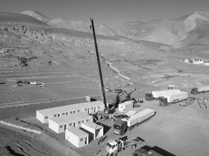 中建八局二公司党群部负责人刘敏正在指挥搭建折叠箱房。她说,地震后,公司立即联系拉萨的板房生产企业,连夜加工出40套折叠箱房,无偿捐赠给受灾群众。