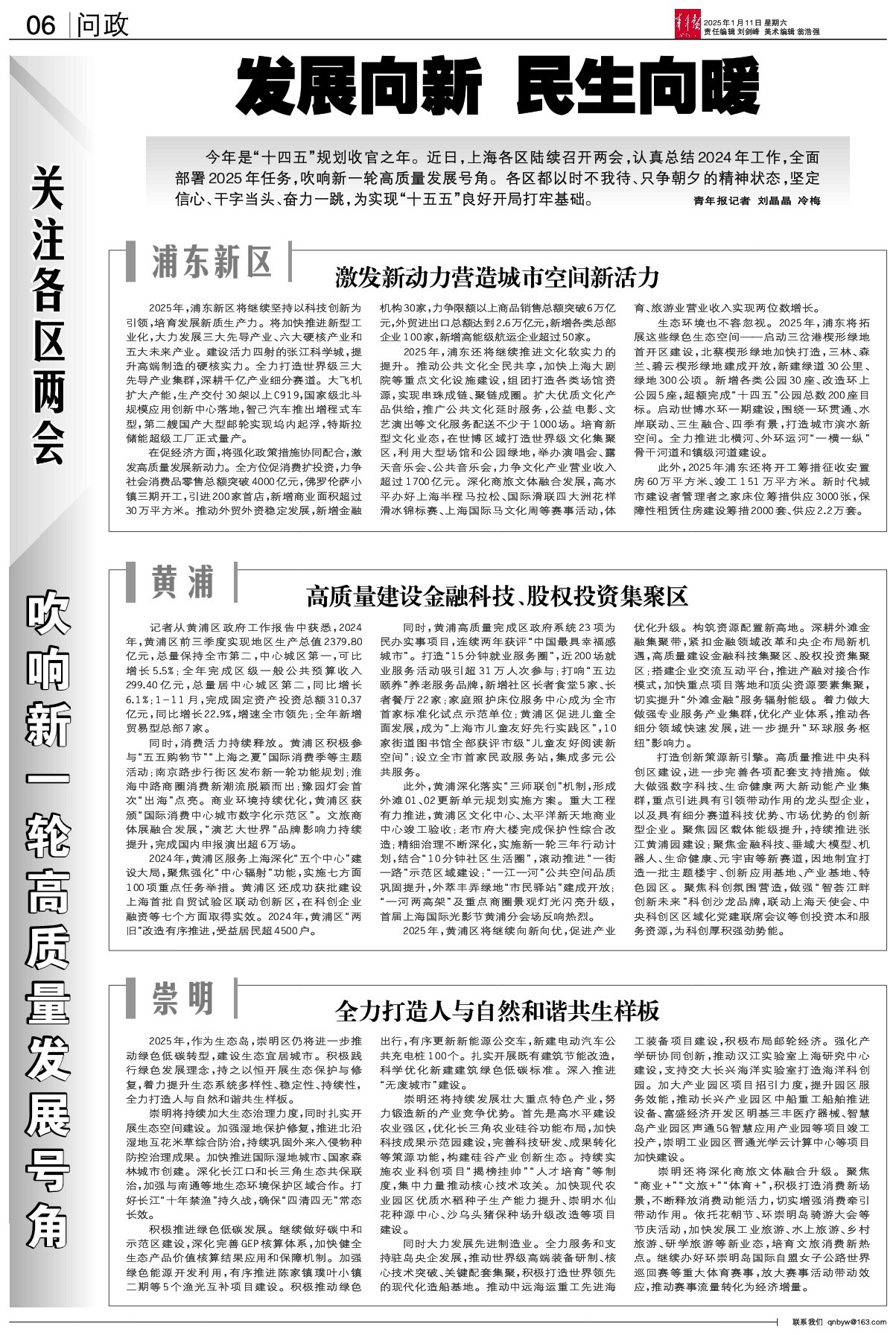 今年是“十四五”规划收官之年。近日,上海各区陆续召开两会,认真总结2024年工作,全面部署2025年任务,吹响新一轮高质量发展号角。各区都以时不我待、只争朝夕的精神状态,坚定信心、干字当头、