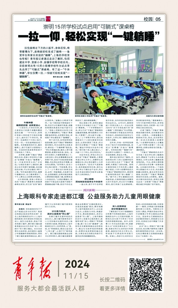2024年9月开学,崇明区启动“午睡工程”,区教育局购买了2660把“可躺”安睡椅,在全区15所小规模学校试点“躺着睡”午休。