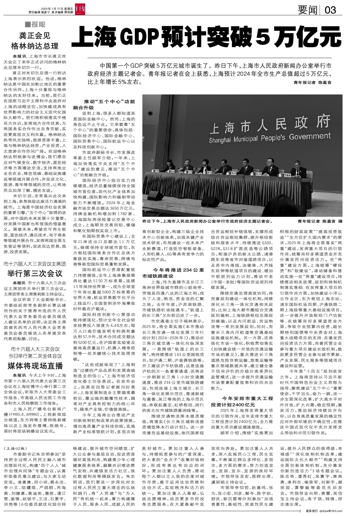 - 上海GDP预计突破5万亿元 中国第一个GDP突破5万亿元城市诞生了。昨日下午,上海市人民政府新闻办公室举行市政府经济主题记者会。青年报记者在会上获悉,上海预计2024年全市生产总值超过5万亿元,比上年增长5%左右。